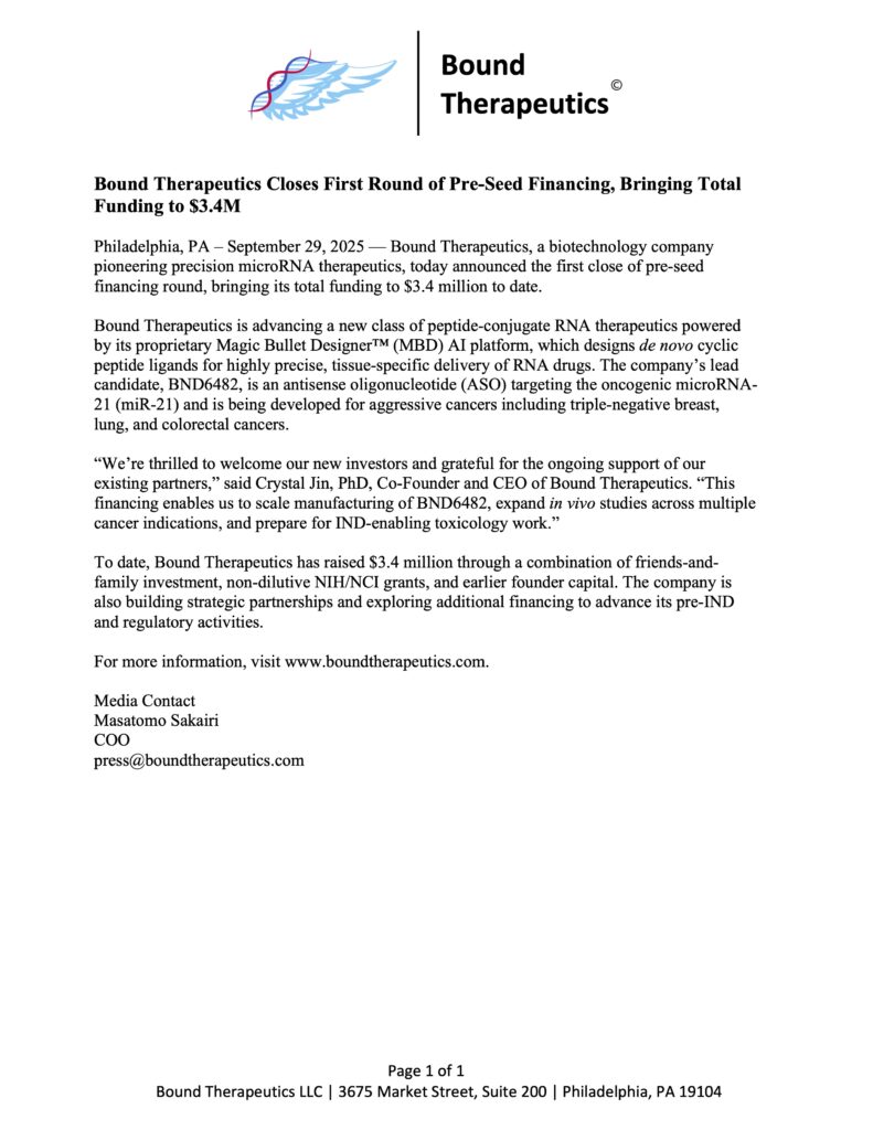 Bound Therapeutics | News | Bound Therapeutics Closes First Round of Pre-Seed Financing, Bringing Total Funding to $3.4M